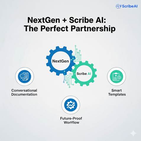 NextGen EHR provides ambulatory practice, hospital, and specialty clinic solutions that are customized. But it is very functional, and overwhelmingly so. Combining it with Scribe AI provides this gap by: