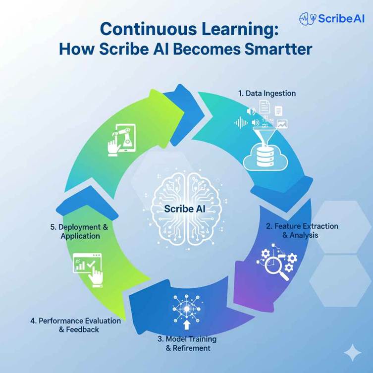 Explore Scribe AI's journey to smarter intelligence! Our continuous learning cycle—from data ingestion and training to real-world application and feedback—ensures constant growth and refinement.
